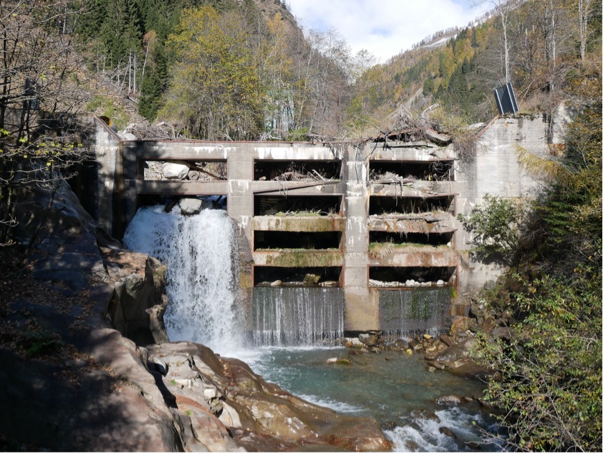 Figure 1: The debris barrier at an elevation of 1,030m ASL, above Moos in Passeier/Moso in Passiria village in upper Passeiertal in Alto Adige/Südtirol, Italy — one of the most unstable valley slopes in The Central Alps, where a landslide caused the formation of the lake “Kummersee” between 1401 to 1774 CE, and historically imposed flood hazard, similar to the contemporary glacial lakes. Note the present large volume of debris delivered by the valley and trapped by the barrier, after passing 60-plus concrete spillways to slow down and prevent the debris from reaching the downstream area. [Photograph by Ahmed Shams, 5 November 2022