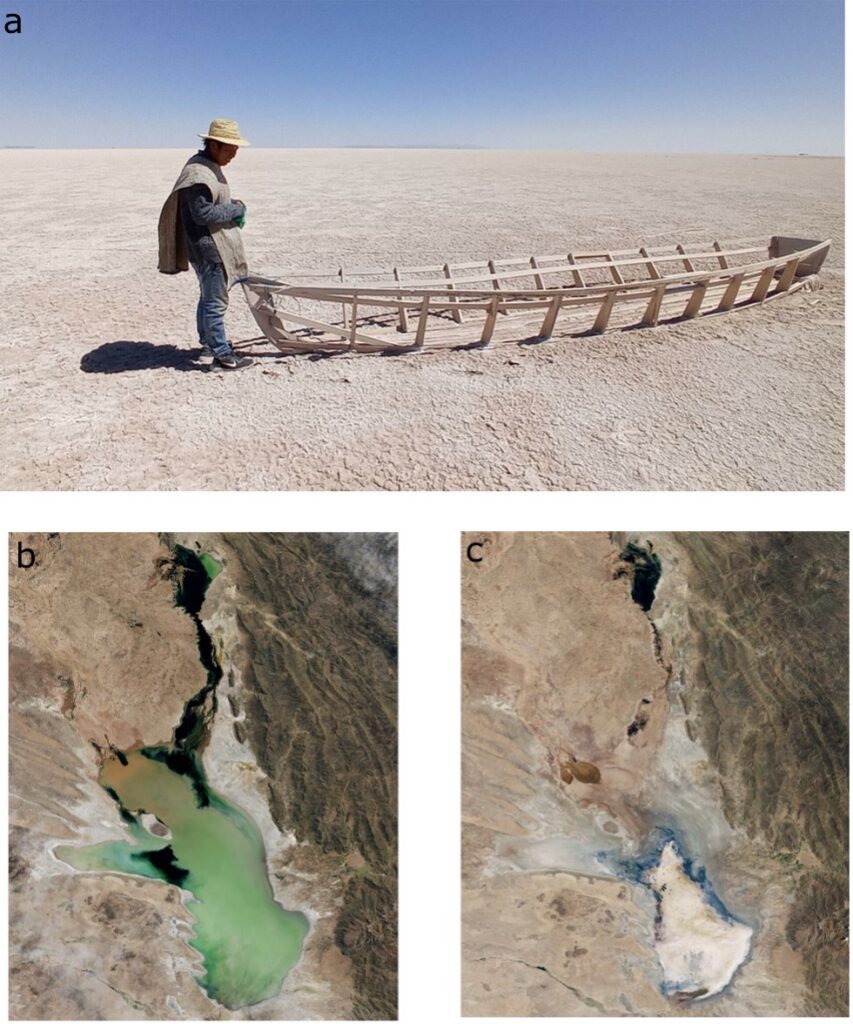 Figure1: Lake Poopó in Bolivia disappeared in 2015, a) Uru with his boat on Lake Poopó. Urus are one of the most ancient cultures in the Americas. Credits: Sebastián Ochoa, Sputnik, available on this website: https://sputniknews.lat/20210907/la-sequia-del-lago-poopo-en-bolivia-amenaza-a-un-milenario-pueblo-indigena–fotos-1115796229.html. b-c) Lake Poopó in 2013 and 2016. Credits: NASA Earth Observatory, Landsat from the U.S. Geological Survey, Jesse Allen and Kathryn Hansen.