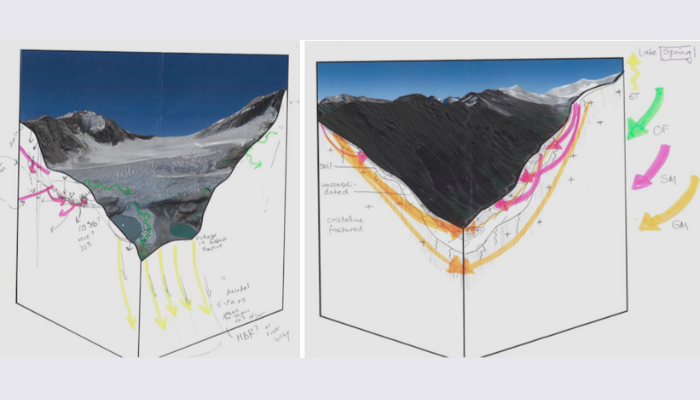 Results of the group exercises “where does the water go?” Groups of participants were given a different, in terms of scale and location, glacierized landscape and were asked to draw the “invisible” sub-surface flowpaths.
