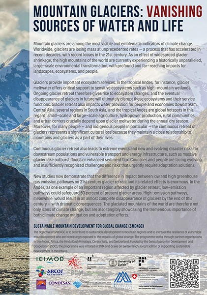 The objective of SMD4GC is to contribute to sustainable development in mountain regions and to increase the resilience of vulnerable mountain people who are increasingly exposed to the impacts of global change. The programme works through partner organizations in the Andes, Africa, the Hindu Kush Himalaya, Central Asia, and Switzerland. Funded by the Swiss Agency for Development and Cooperation (SDC), the programme was initiated in 2014 and draws on Switzerland’s long tradition of supporting sustainable development in mountains.