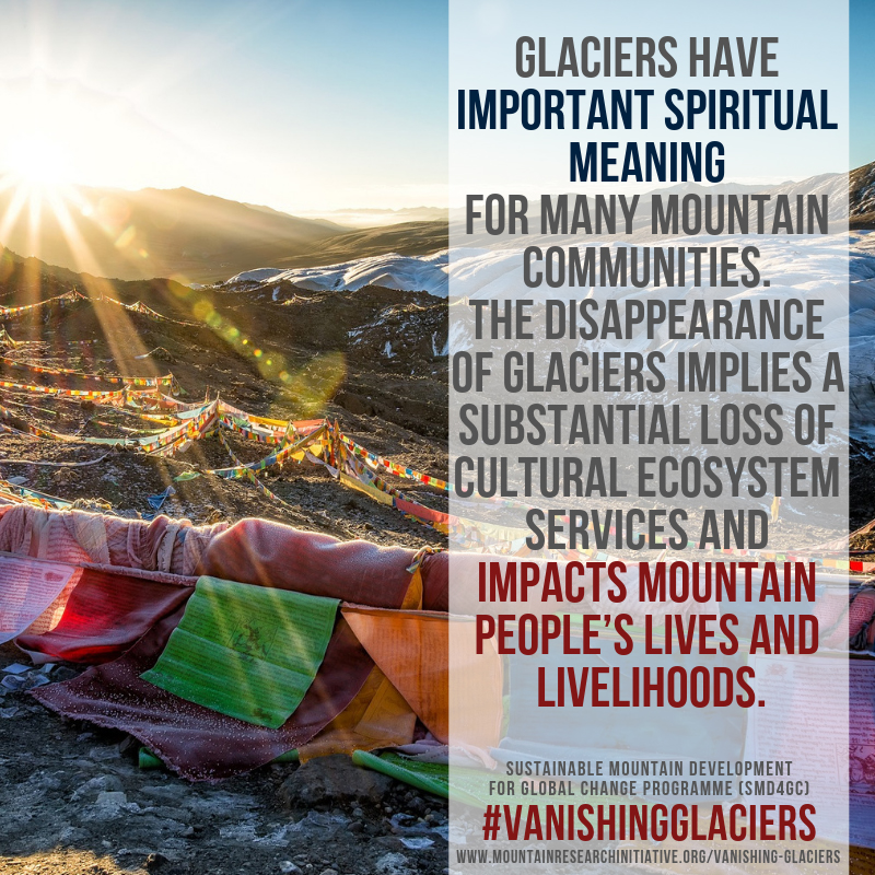 Glaciers have important spiritual meanings to many mountain communities. The disappearance of glaciers implies a substantial loss of cultural ecosystem services and impacts mountain people’s lives and livelihoods.
