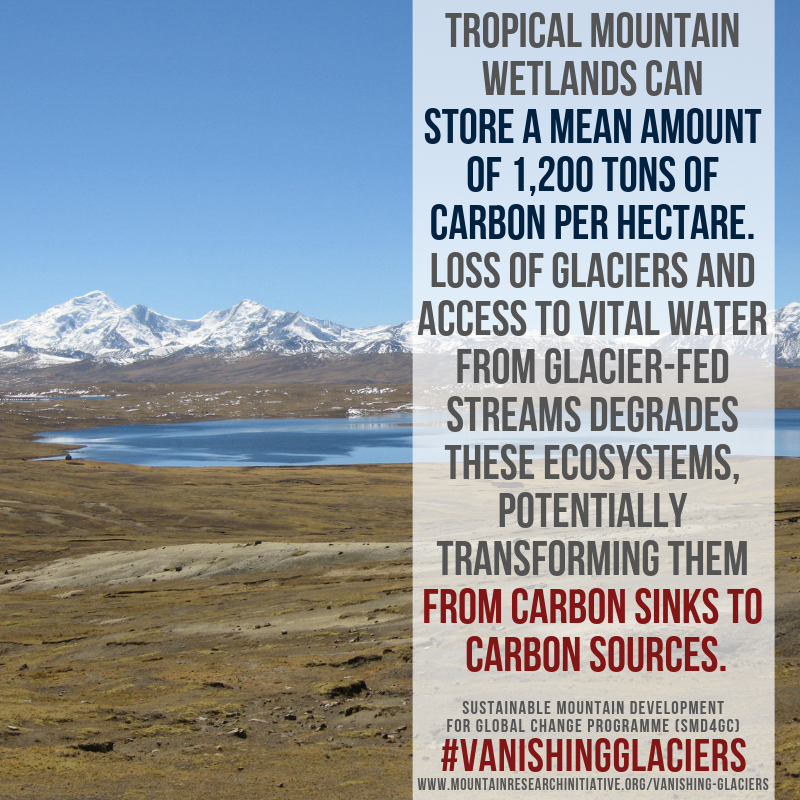 Tropical mountain wetlands can store a mean amount of 1,200 tons of carbon per hectare. However, loss of glaciers and access to vital water from glacier-fed streams degrades these ecosystems – potentially transforming them from carbon sinks to carbon sources.