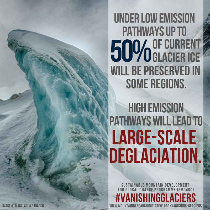 Under low emission pathways up to 50% of current glacier ice will remain in some regions. High emission pathways will lead to large-scale deglaciation.